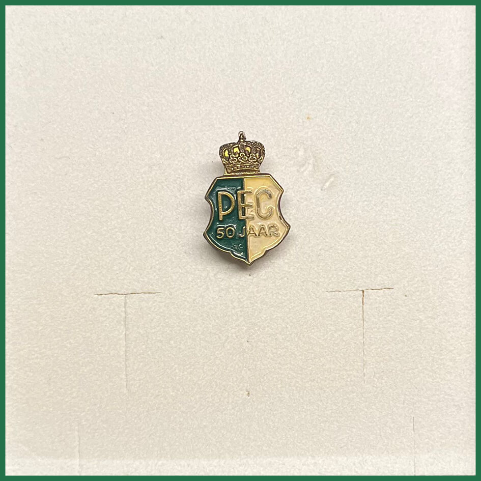 Dit speldje ontving Klaas Drost van de supportersvereniging (via waar het speldje ook te koop was voor supporters) ter gelegenheid van zijn huwelijk. Ondanks dat dit speldje geen onderdeel uitmaakt van het PEC in the days archief, vond ik hem dusdanig bijzonder om hem alsnog op deze pagina te zetten!